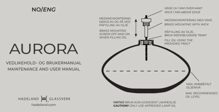 Fyll aldri oljen til mer enn anbefalt mål som vises i bruksanvisningen medfulgt. Veken skal ikke stikke opp mer enn 1 mm over kanten. Bruk kun godkjent lampeolje. La aldri produktet stå uten tilsyn når den er tenkt. Olje kjøpes separat. Dersom flammen er for høy, blafrer eller soter er veken for høy. Blås ut lyset, la den stå til den blir kald og trykk forsiktig ned veken til riktig høyde.