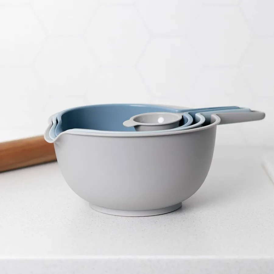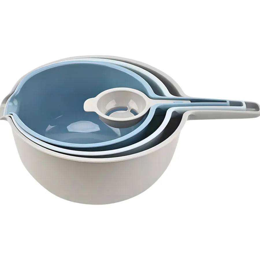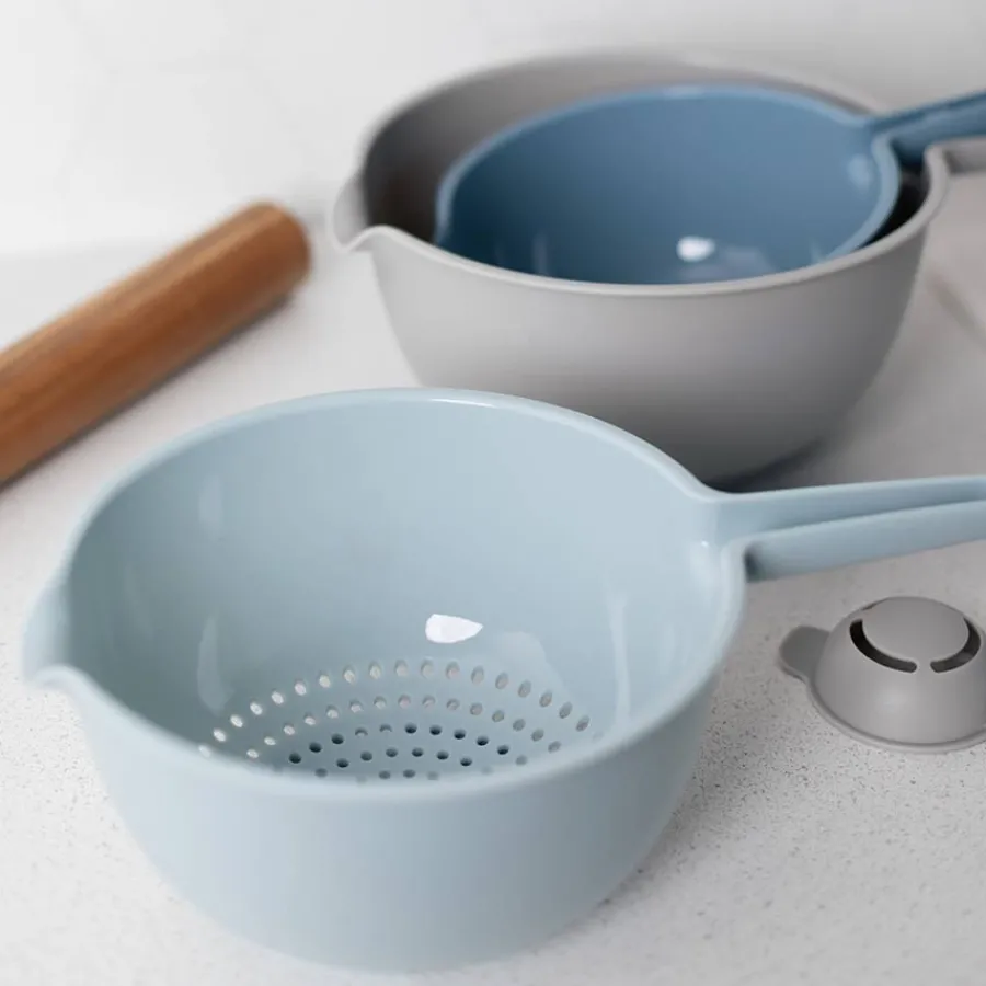 Dette praktiske bakebollesettet er en komplett løsning for deg som liker å bake og lage mat. Settet inkluderer to romslige bakeboller, et solid dørslag og en hendig eggeskiller – alt du trenger for en enkel og organisert bakeopplevelse. Bakebollene er laget av BPA-fri plast og har anti-skli bunn, så de står stødig på kjøkkenbenken under bruk. Hele settet er designet for å tåle oppvaskmaskin, som gjør rengjøringen rask og enkel. Settet er også plassbesparende, da bollene kan stables inni hverandre.