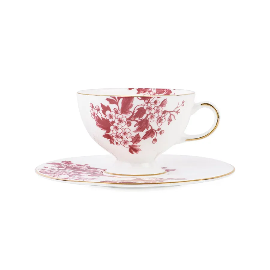 Denne koppen med skål på 20 cl i burgunder er perfekt for kaffe og små varme drikker. Med en vakker gullkant blir settet både praktisk og dekorativt. Perfekt for en elegant kaffestund.