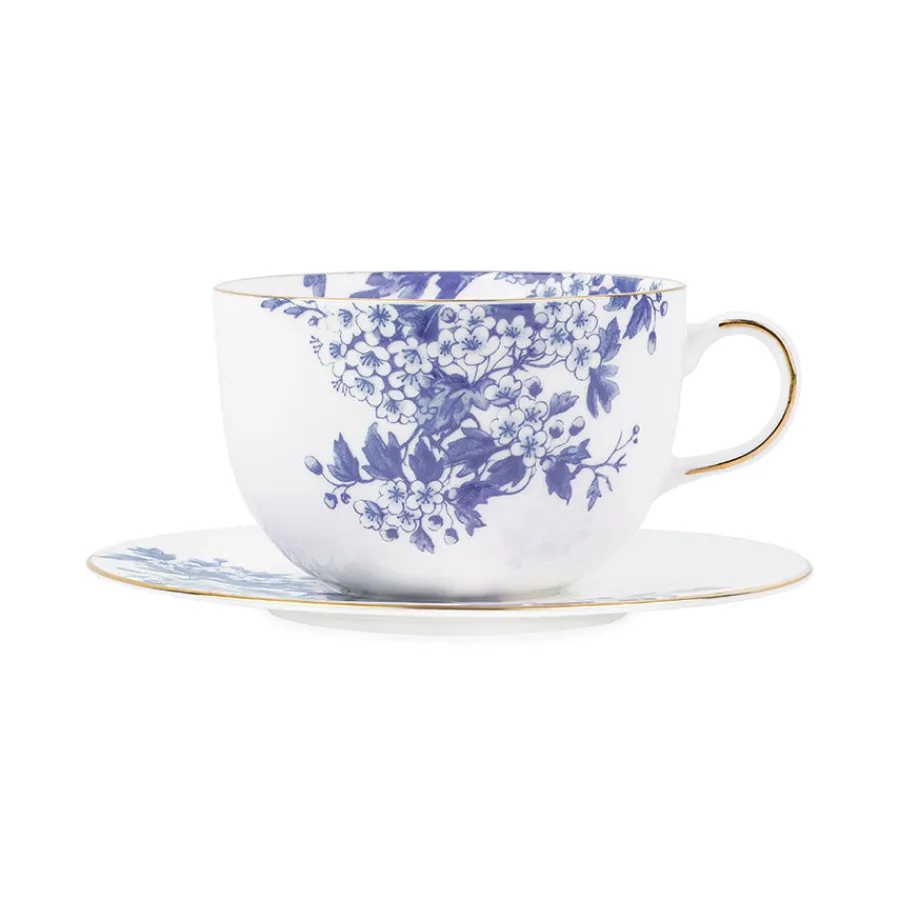 Denne koppen og skålen i blåfarge rommer 40 cl, ideell for en stor kaffe eller te. Gullkanten gjør den til et sofistikert tillegg på bordet.
