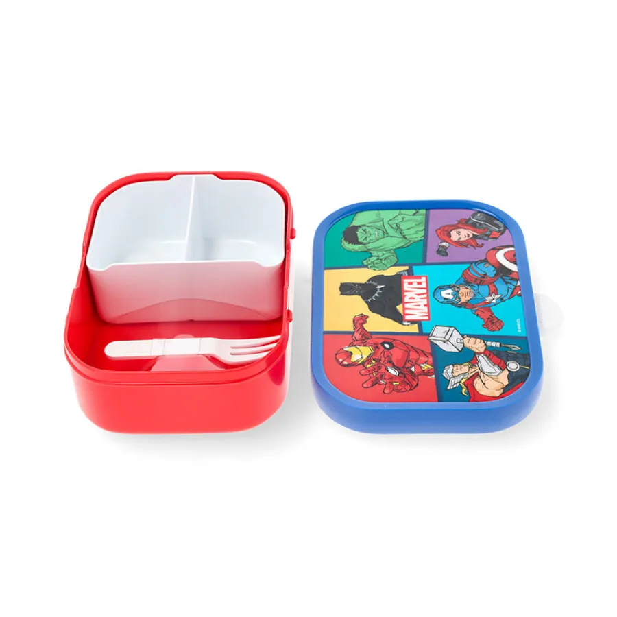 Matboks med motiv av superheltene fra Avengers. Matboksen er enkel for barnet å åpne og den har gaffel og et dobbelt rom som kan tas ut. Formiddagsmaten i barnehagen og på skolen blir ekstra stas med selskap av blant andre Iron Man, Captain America og selveste Hulken! Matboksen er 17,5 x 13 x 6 cm og har god plass til barnets måltid.