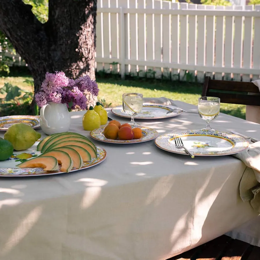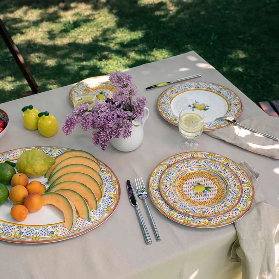 Serveringsfat fra Christiania 1739 og serien Capri. Fatet omkranses av et vakkert mønster og delikate farger inspirert av den flotte øyen Capri i Italia. Servisedelene fra serien er fremstilt i melamin, som gjør delene utmerket både til innendørs og utendørsbruk.