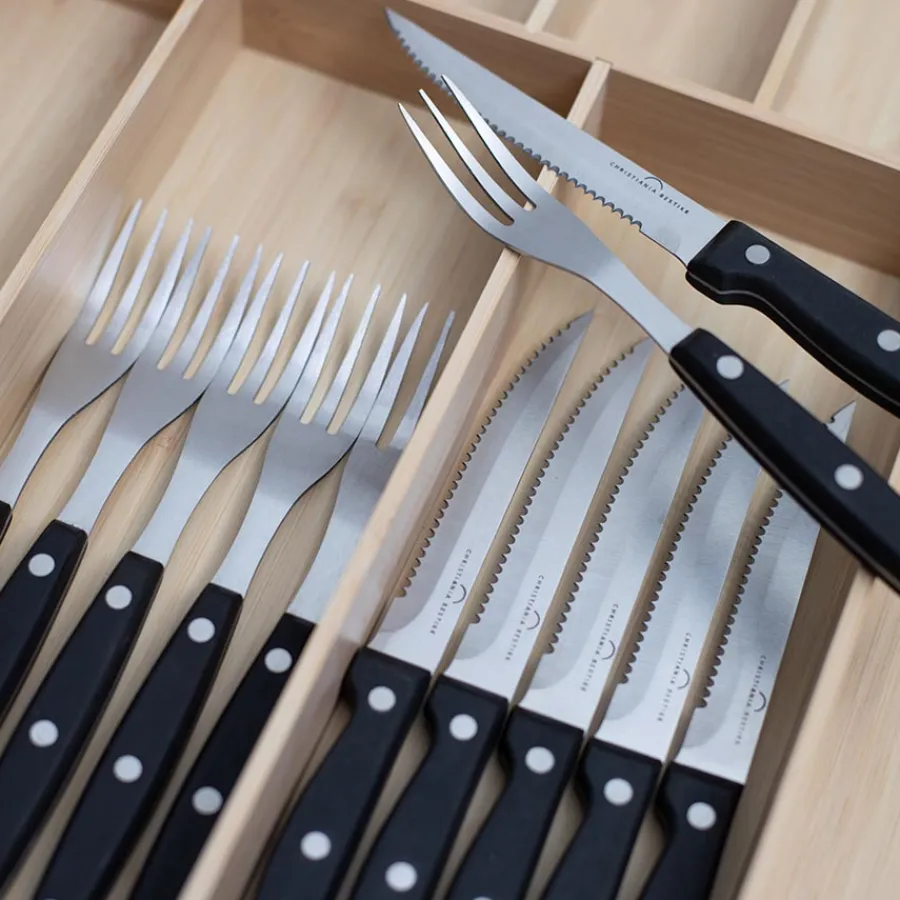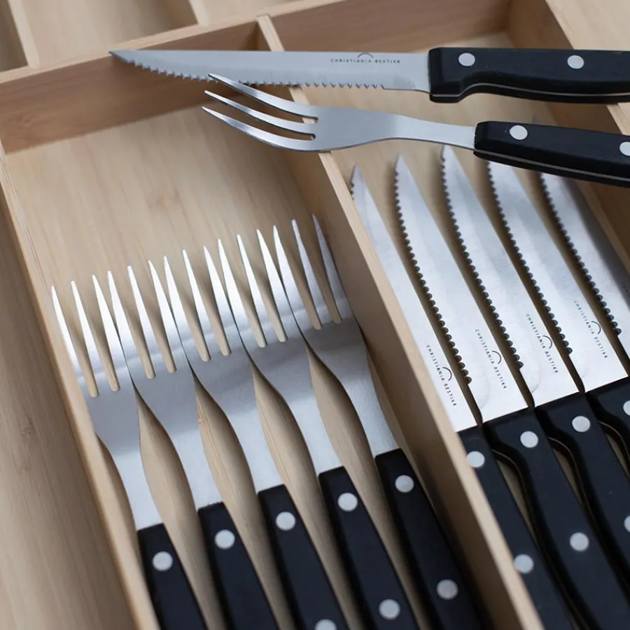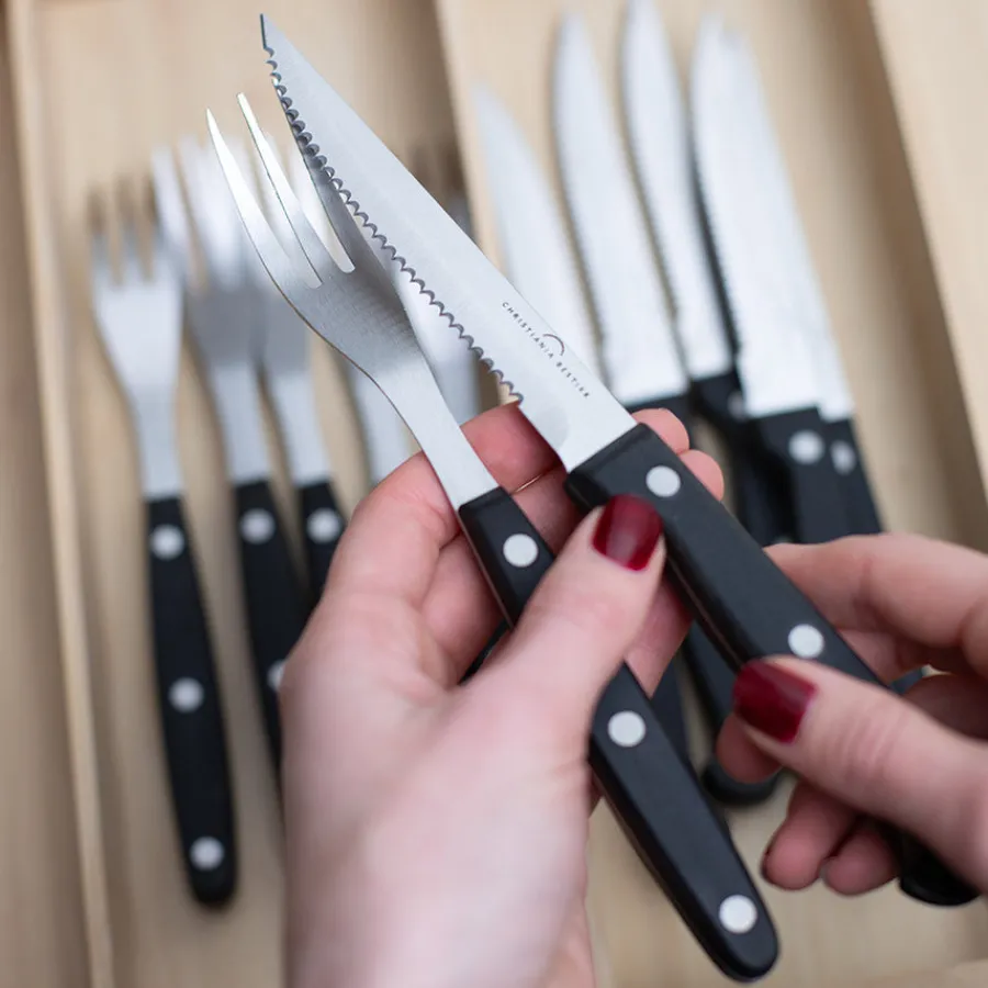 Grillbestikk til 6 personer fra den flotte bestikkserien Mineo. Bestikket består av 6 skarpe kniver som lett skjærer gjennom en saftig biff og annet stekt og grillet kjøtt, og 6 gafler. Det klassiske designet med sort grep er en favoritt til biff- og grillmiddagen. Bestikket er fremstilt i 420 rustfritt stål og kan rengjøres i oppvaskmaskin .