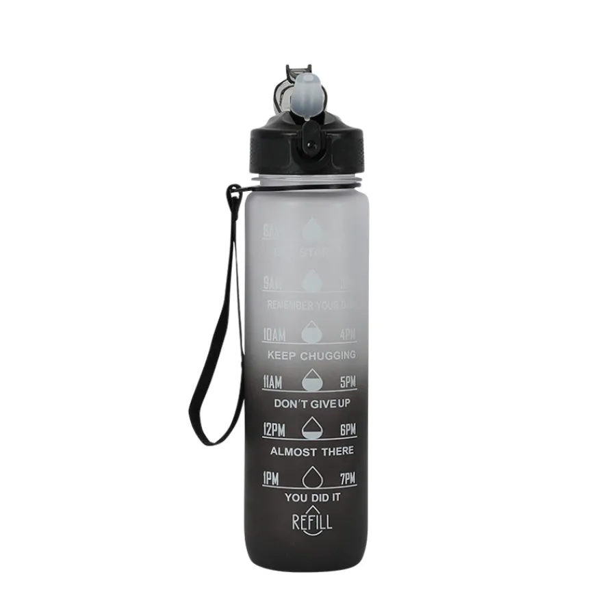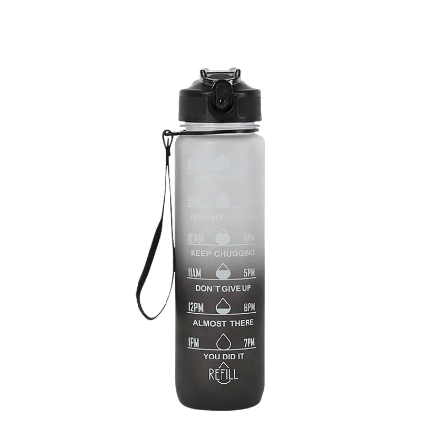 Motivasjonsflaske på 1 liter i svart ombre fra Nova Dynamic. Drikkeflasken er designet med klare måleenheter som minner deg på å drikke rikelig med vann i løpet av dagen, og er utstyrt med en praktisk bærestropp. Perfekt til skole, jobb og trening!