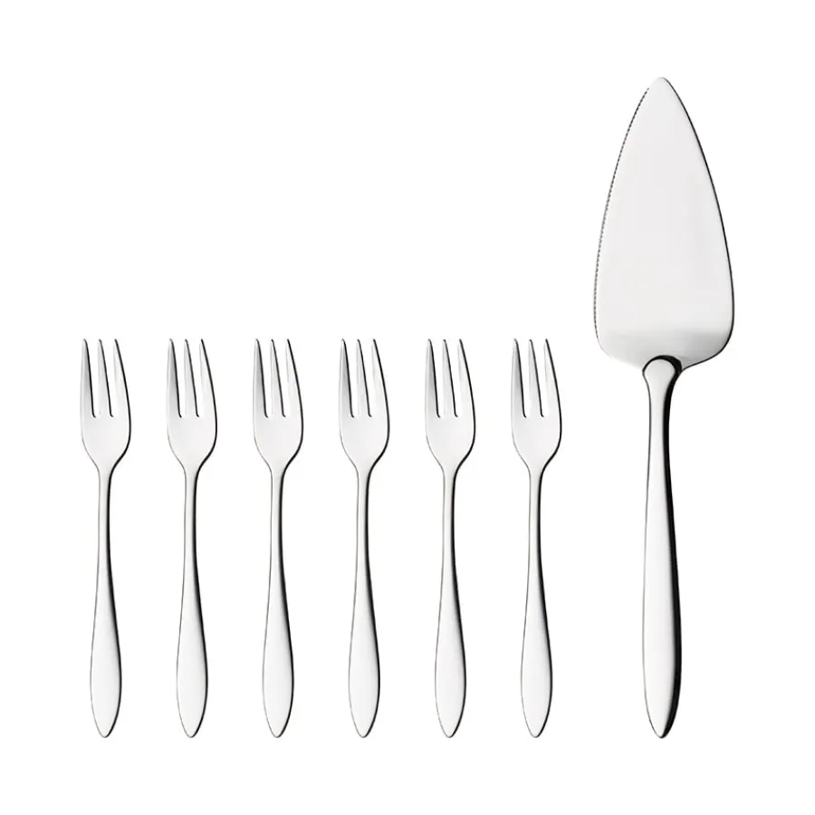 Kakesett fra Hardanger Bestikk og den minimalistiske serien Fjord, som ble designet i 2000 av Odd Leikvoll. Det flotte settet inneholder en kakespade på 25,1 cm med fine tagger og 6 stk kakegafler på 15,3 cm. Bestikket er fremstilt i 18/10 stål og tåler oppvaskmaskin.