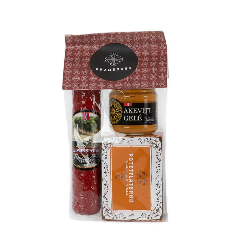 Gavepakke med rødvinspølse, potetflatbrød og akevittgelé fra Kramboden. Pakken inneholder autentiske smaker fra norsk matkultur, som sammen gir en spennende smaksopplevelse. Perfekt julegave til en venn, kollega eller familie.