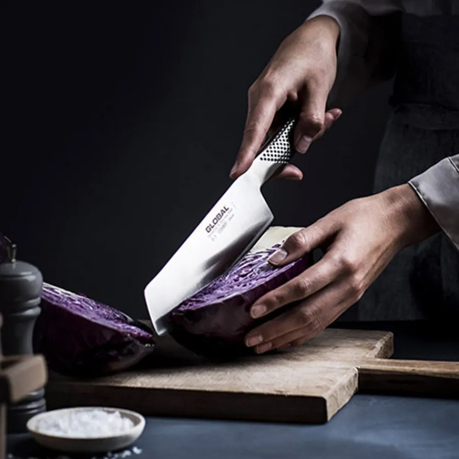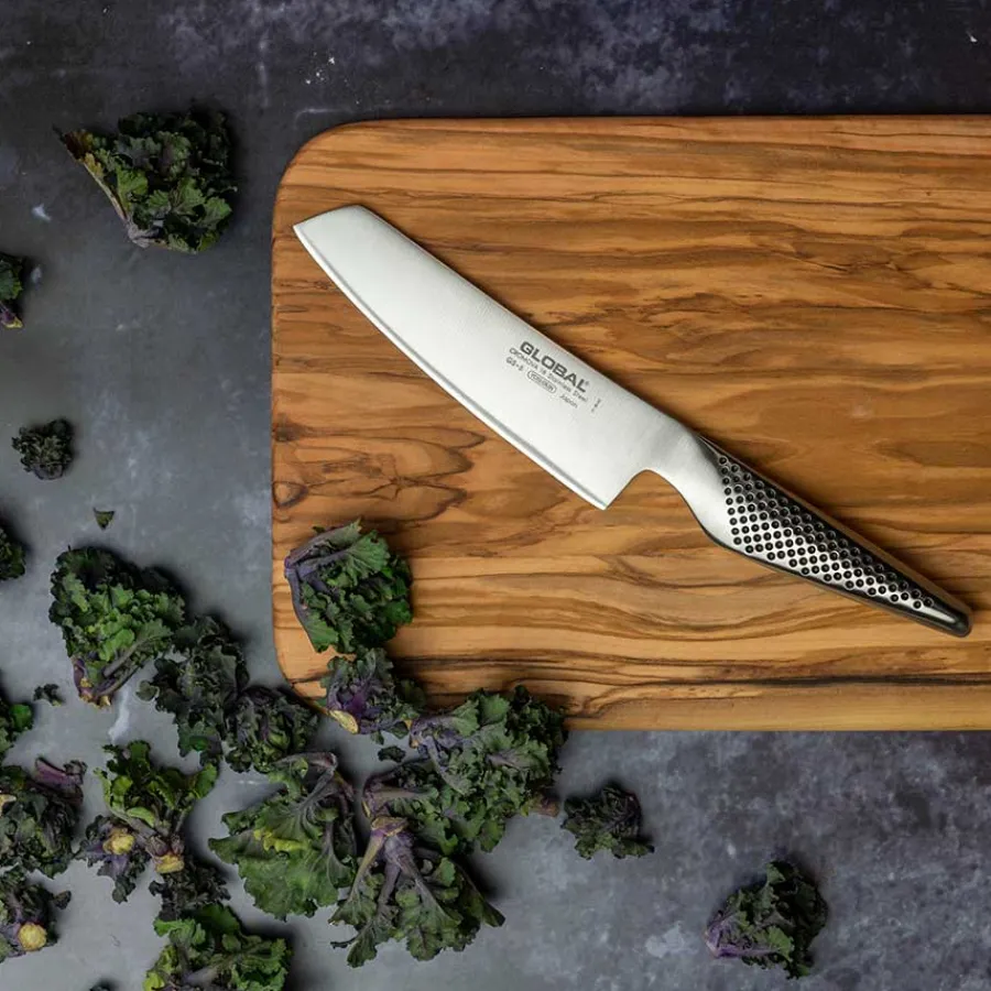 GS-5 grønnsakskniv fra Global. Kniven er designet i en nesten rektangulær form, som gjør at råvarer enkelt kan skjæres opp uten å måtte skyve eller dra kniven. Knivens funksjonelle form gjør den utmerket til intensiv hakking eller når du ønsker å unngå kutting i roten på en løk eller rotgrønnsak. Grønnsakskniven er fremstilt i rustfritt stål og måler 14 cm.