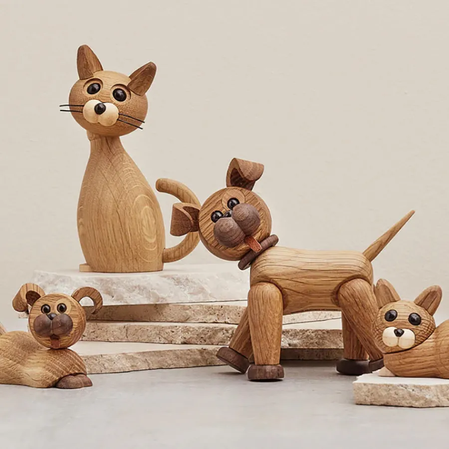 Happy er en sjarmerende trefigur som hyller menneskets beste venn og Danmarks mest populære husdyr. Laget av eik, valnøtt og ask, med en liten tunge av økologisk lær, har Happy et mildt og søtt uttrykk som gir liv til interiøret. Med sitt vennlige blikk og gjennomførte detaljer er han en del av den danske tradisjonen med tredyr som utstråler både karakter og personlighet. Happy passer perfekt i ethvert hjem, enten alene eller som en del av en samling, og minner oss om gleden ved kjæledyrenes trofaste vennskap.