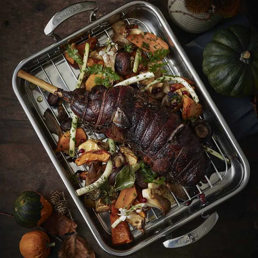 Lanpanne på 5 liter med rist fra Scanpan og serien Impact. Langpannen er fremstilt i rustfritt stål med en base av aluminium, som sikrer en rask oppvarming. Pannen er utstyrt med to praktiske håndtak til servering, og det stilrene designet gjør den flott stående på bordet. Den ovnssikre pannen på 42 cm x 26 cm tåler induksjon og kan rengjøres i oppvaskmaskin.