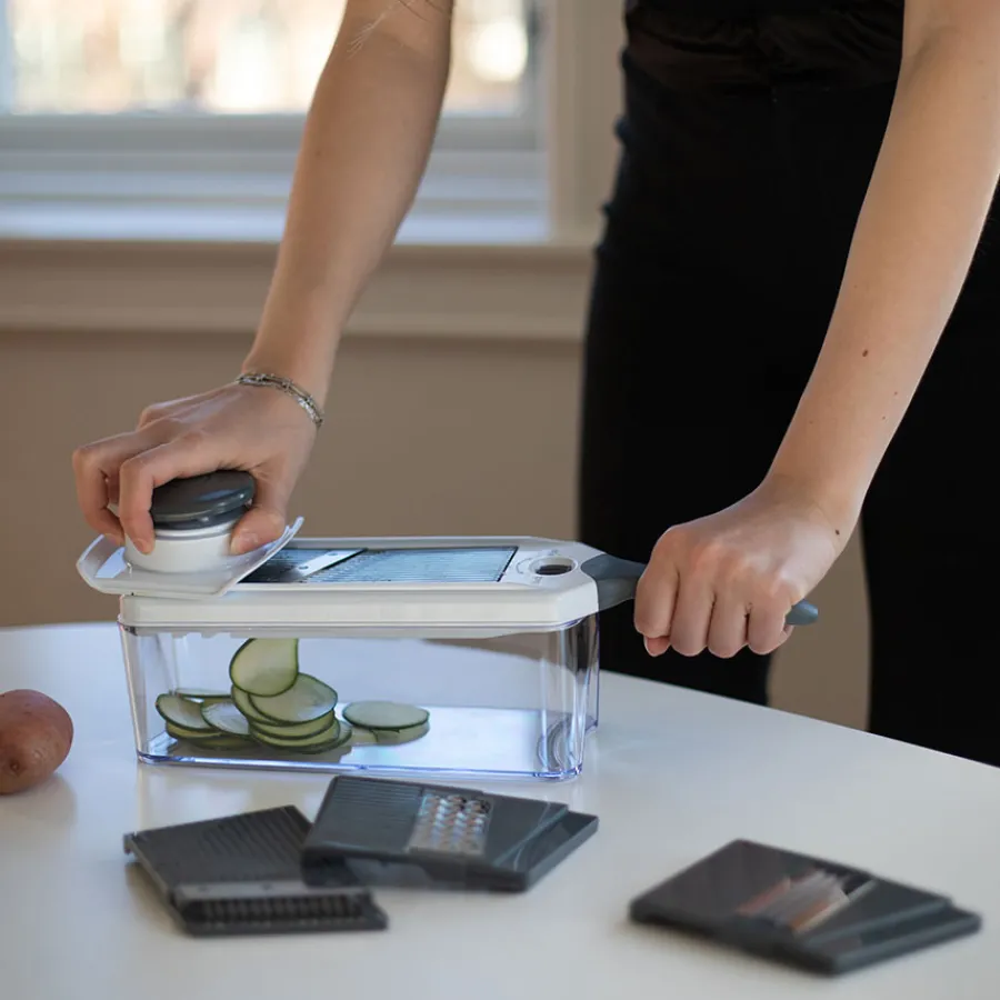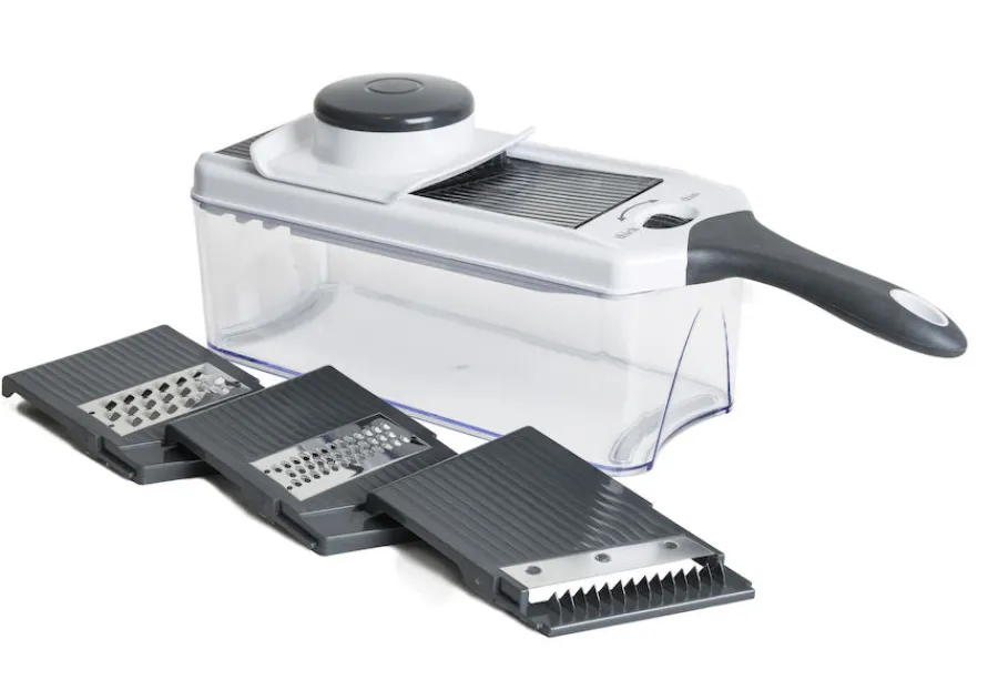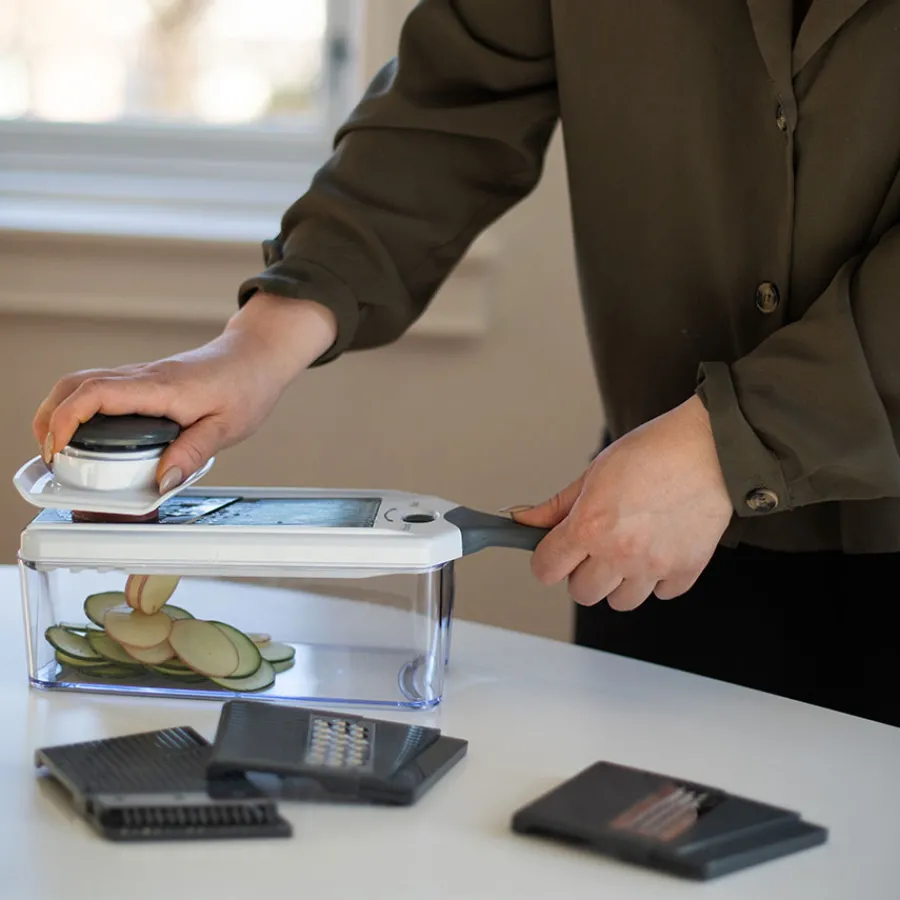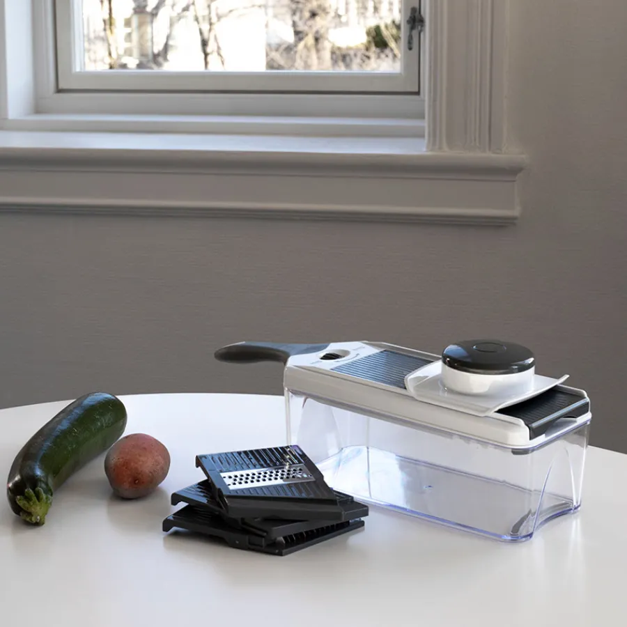 Mandolin rivjern i 7 deler fra Christiania 1739 og serien Kitchenline. Rivjernets 7 deler gjør at du enkelt kan velge mellom oppkutting i skiver, strimler eller rasping, og den praktiske boksen gjør at du unngår unødvendig med søl på benken. Perfekt til alt fra rasping av grønnsaker og ost til oppkutting av potet og agurk i tynne skiver. Aller deler kan rengjøres i oppvaskmaskin, i øvre kurv.