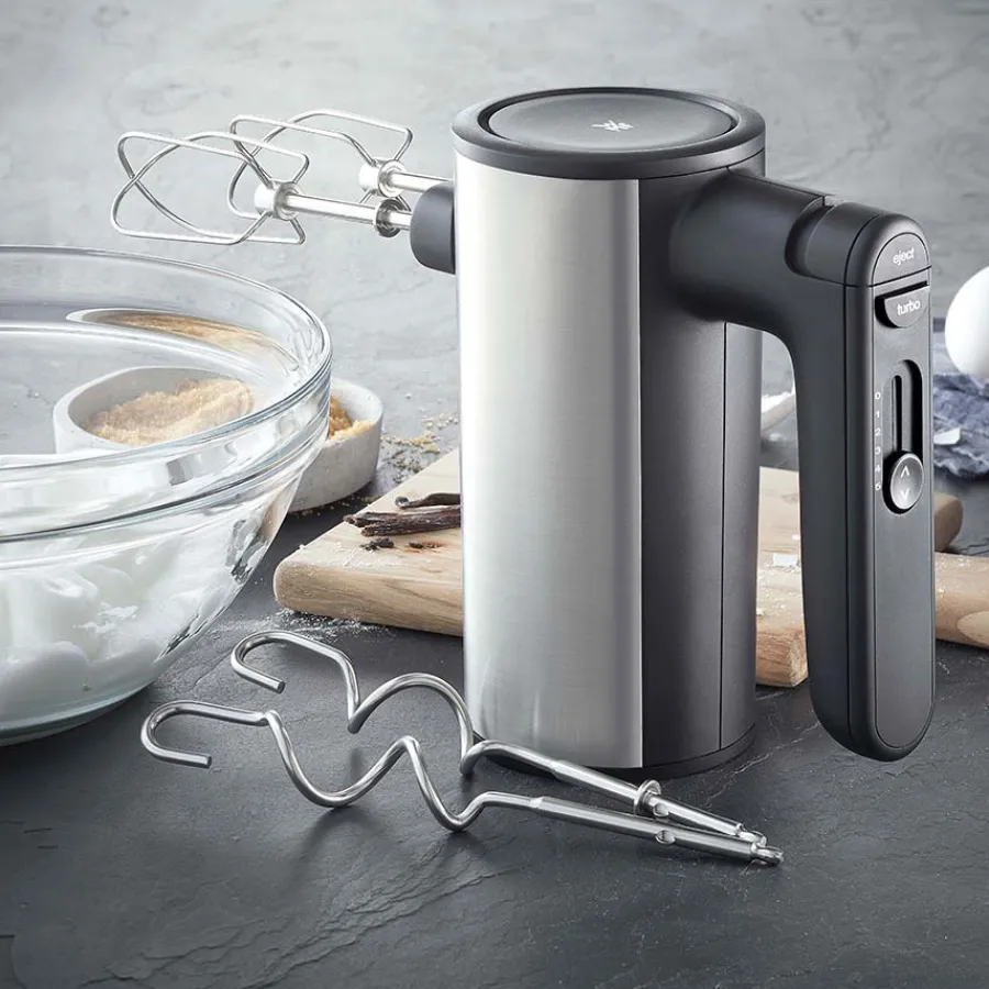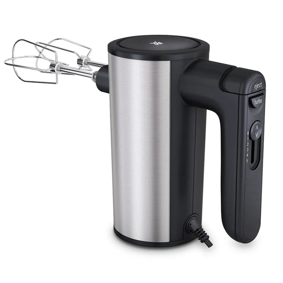Håndmikser fra WMF i serien Kult X. Håndmikseren er fremstilt i Cromargan 18/10 rustfritt stål og plast av høy kvalitet. Det følges med 2 visper og 2 deigkroker, og håndmikseren har 5 hastighetsnivåer med turbo funksjon for maksimal ytelse.