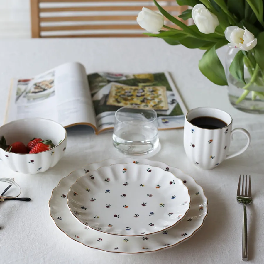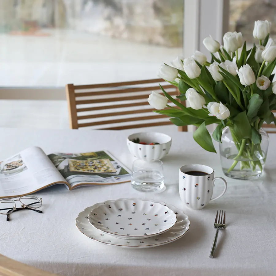 Denne delikate skålen fra Nova Lilly-serien er perfekt til servering av frokost, snacks, bær eller dessert. Med små håndmalte blomster, gullkant og bølget form gir den en romantisk og tidløs stil til borddekkingen. Den kompakte størrelsen på 13 cm gjør den anvendelig både til hverdags og selskaper.Kombiner med andre deler fra Lilly-serien for en komplett og sjarmerende bordopplevelse. Serien er designet for å kunne mikses på tvers av farger og former.Sporadisk håndvask anbefales for å bevare gullkanten. Tåler ikke mikrobølgeovn.