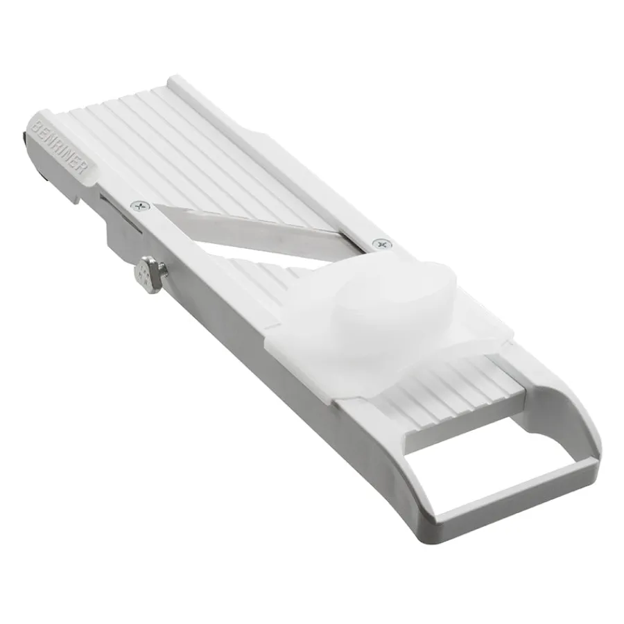 Denne førsteklasses mandolinen gjør det enkelt å skjære grønnsaker og rotfrukter i presise skiver eller strimler. Med et håndslipt, trinnløst blad kan du justere tykkelsen fra 0,5 til 7 mm for ønsket resultat. Den leveres med tre utskiftbare blader for strimling og julienne, og fingerbeskyttelsen sikrer trygg bruk. Anti-skli på undersiden gir stabilitet, og den kompakte størrelsen gjør den lett å håndtere.
