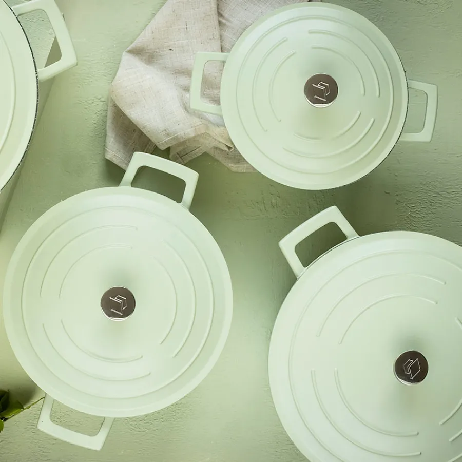 Gryte fremstilt i en stilrik mintgrønn farge fra Masterclass. Gryten er laget i støpt aluminium, som på samme måte som støpejern er et robust materiale designet for å vare, men som er betydelig lettere. Aluminium kommer med svært gode varmeledende egenskaper, slik at maten tilberedes effektivt og jevnt, på koketoppen eller i stekeovnen. Gryten er fremstilt med et robust to-lags ripesikkert belegg som kommer med sammen gode egenskaper som et non-stick belegg, og kan rengjøres i oppvaskmaskin.
