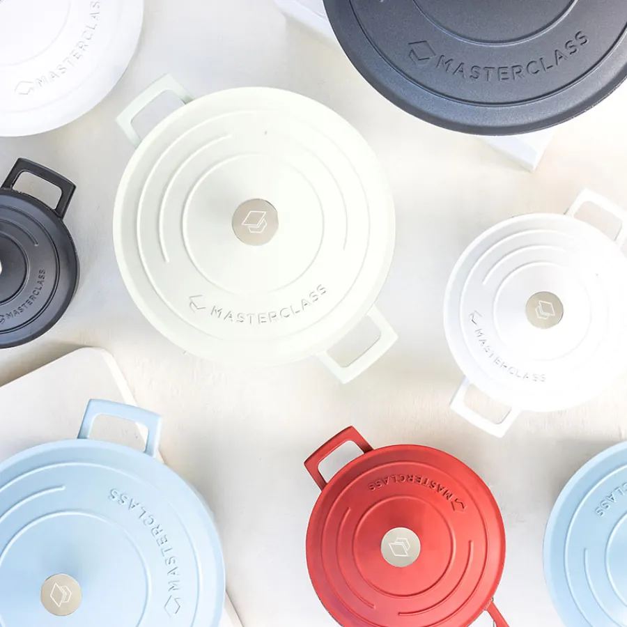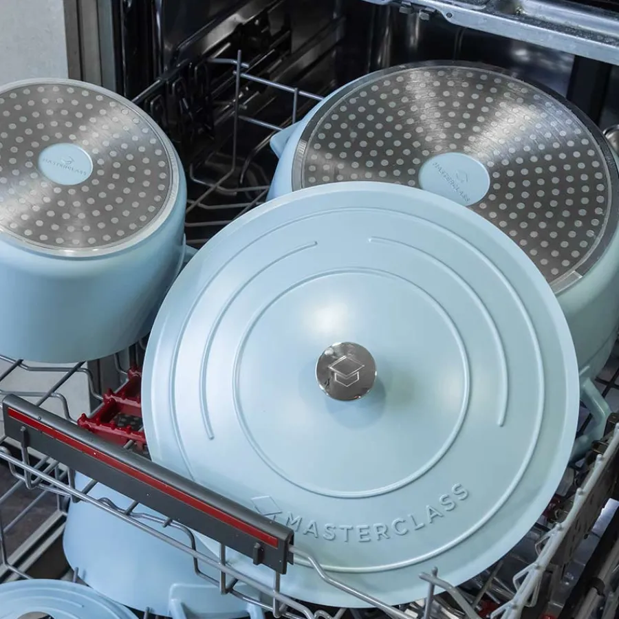 Gryte i støpt aluminium på 5 liter fra Masterclass. Her får man de gode kvalitetene som ved en støpejernsgryte. Den stilfulle gryten kommer i fargen himmelblå og er laget i høykvalitets aluminium, som sikrer en utmerket varmefordeling. Gryten er forsterket med et dobbelt ripesikkert lag som også fungerer som et non-stick belegg, og tåler stekeovn på 200°C. Kan rengjøres i oppvaskmaskin.