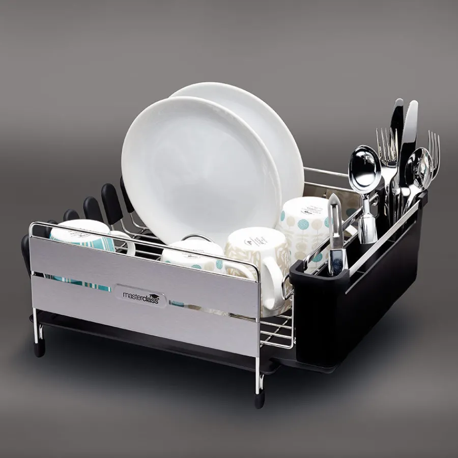 Oppvaskstativ i 44,5 cm fremstilt i rustfritt stål fra Masterclass. Oppvaskstativet fra Masterclass er utformet med et integrert stativ for tallerkener og skåler, i tillegg til et stativ for krus og glass. På enden av stativet henger det en praktisk avtagbar bestikkurv. Oppvaskstativet måler 44,5 cm x 32 cm x 19,5 cm.