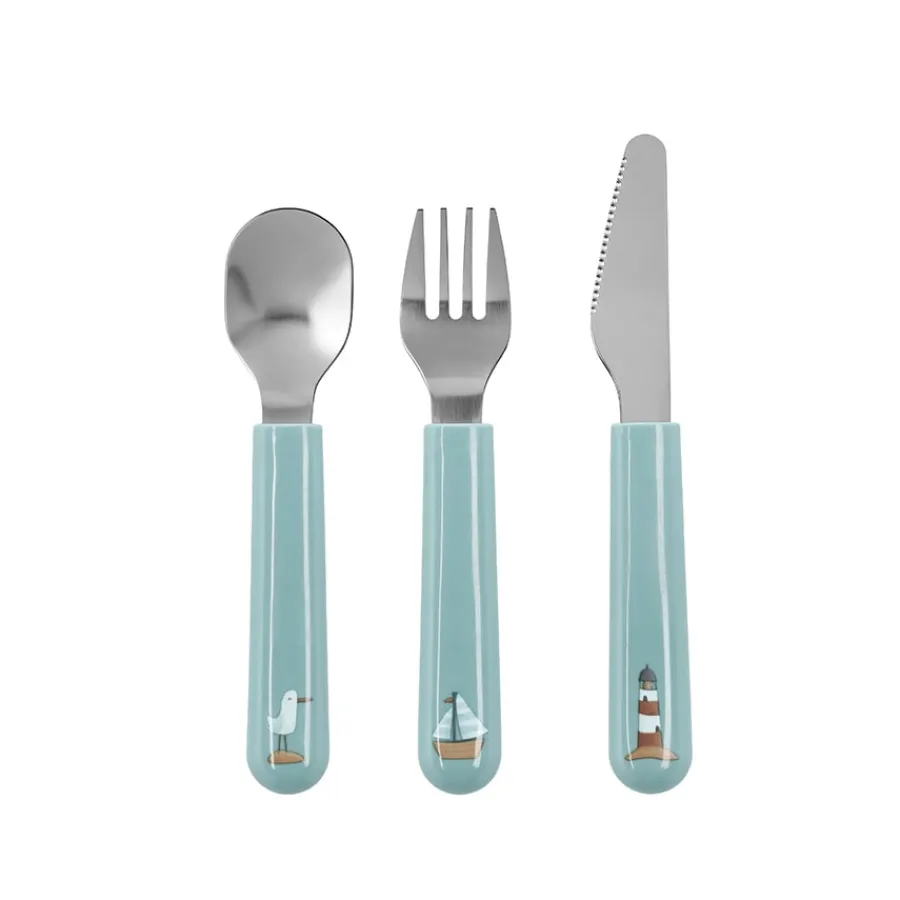 Barnebestikk fra Mepal og serien Mio. Bestikket er fremstilt i rustfritt stål og utformet med et komfortabelt håndtak i BPA-fri plast, som sikrer et godt grep for de små. Delene er laget for barn på 12 måneder og oppover. Settet inneholder en skje, en spisekniv og en gaffel som tåler oppvaskmaskin.