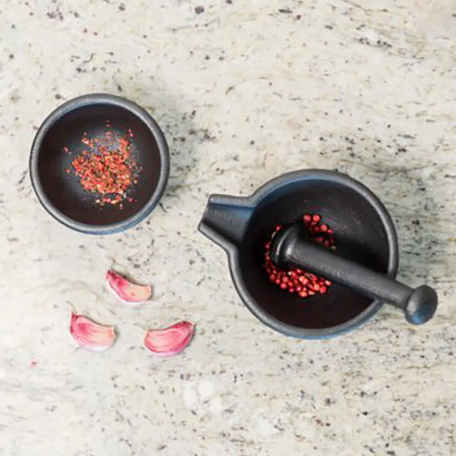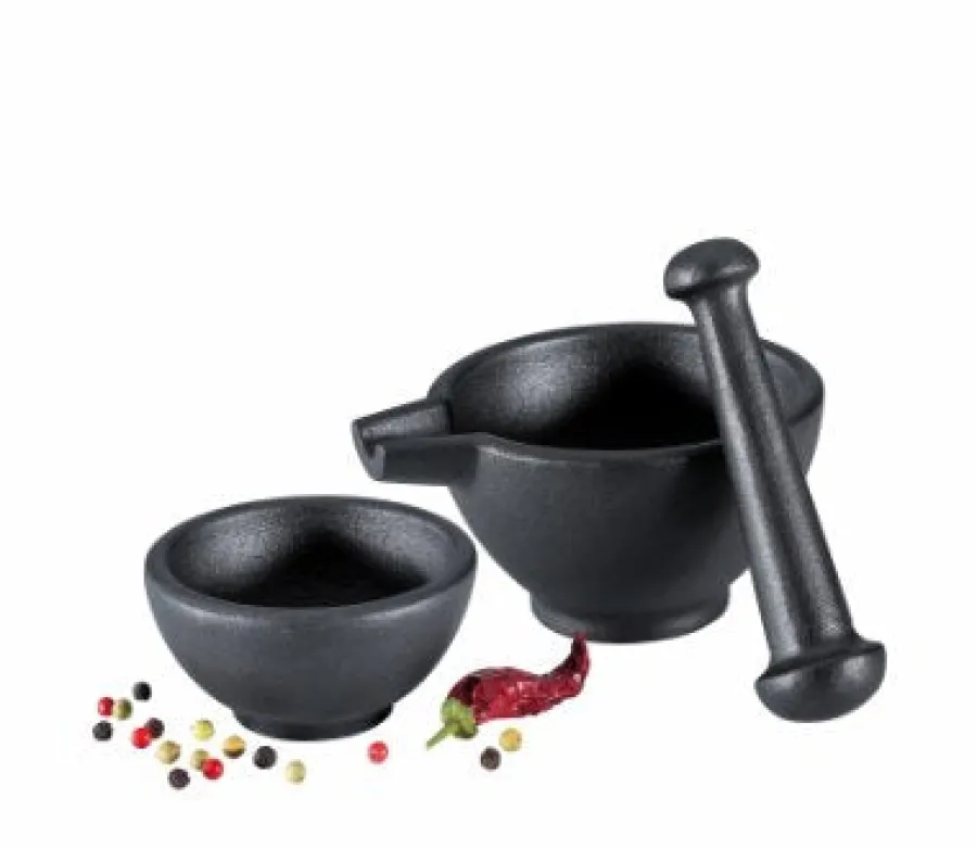 Denne kompakte morteren i matt, svart støpejern fra Zassenhaus leveres med to praktiske skåler, hvorav én har helletut for enkel servering. Perfekt for mindre porsjoner av krydder, urter og sauser, samtidig som den er funksjonell og elegant på kjøkkenet.