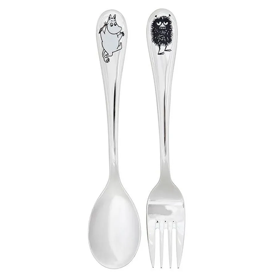 Bestikksett til barn med skje med motiv av Mummitrollet og gaffel med motiv av Stinky. Bestikket er i rustfritt stål og kan vaskes i oppvaskmaskin.