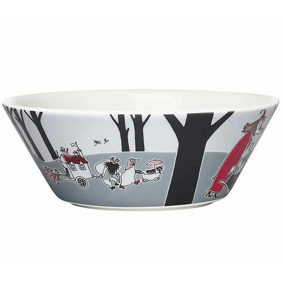 Mummi skål fra Arabia med lekent motiv fra Mummidalen. Motivet «Mummi flytter» er hentet fra boken «Kometen kommer» Mummitrollet og Sniff legger ut på tur til et observatorium i fjellene, for å spørre en professor om kometen som de har oppdaget på himmelen, vil ødelegge verden. De populære samleobjektene i porselen fra Arabia er ildfaste og tåler ovn og mikrobølgeovn, men må stå på rist i ovnen og ikke bakeplate. Mummiskålene kan vaskes i oppvaskmaskin.