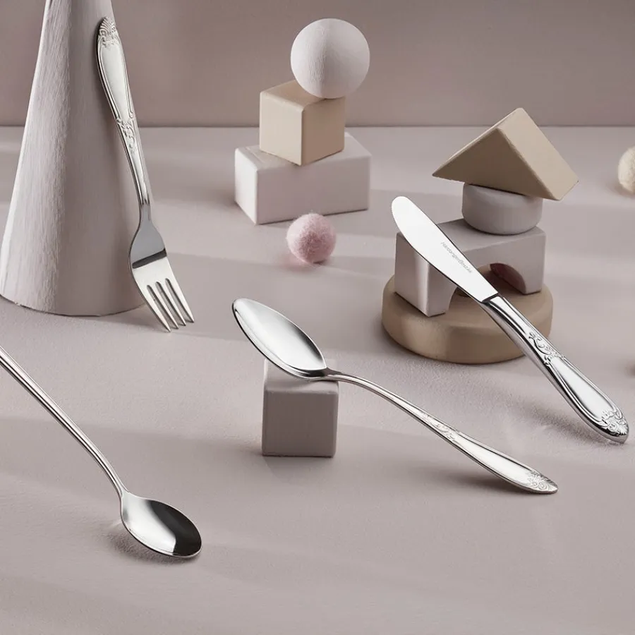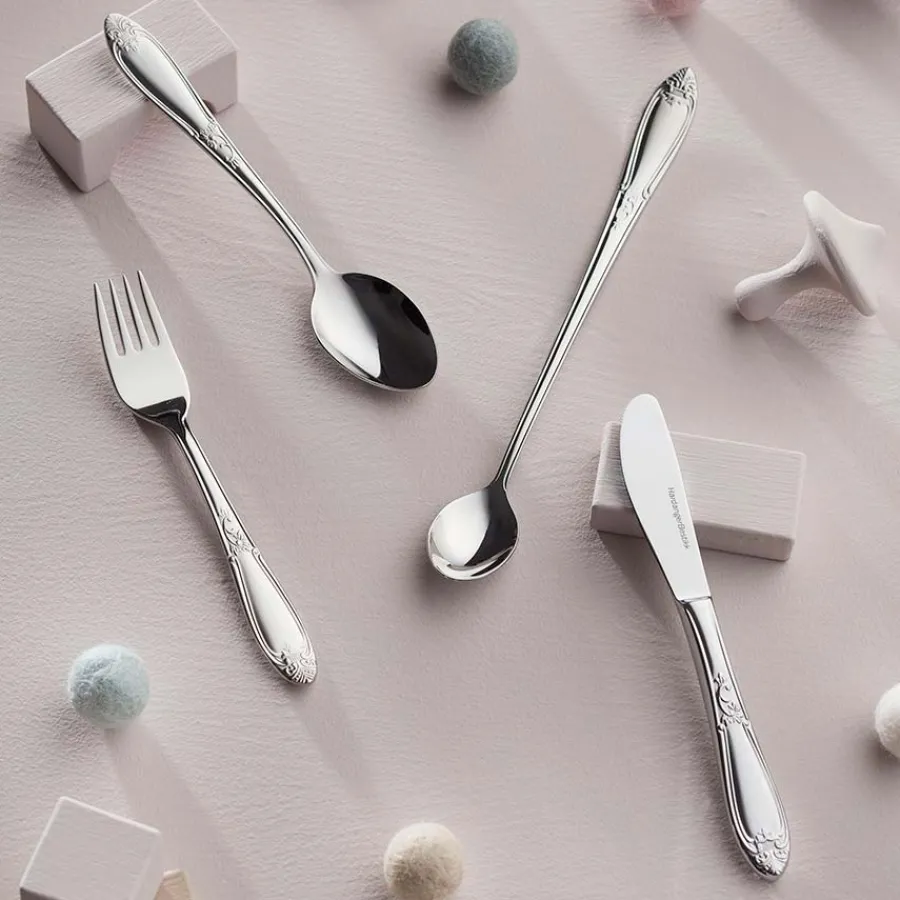 Barnebestikk fra tradisjonsrike Hardanger Bestikk og serien Nina. Et vakkert bestikk inspirert av rosemaling og rokokko-stilen fra 1700-tallet. Bestikket er utformet for et behagelig grep og utmerket til barn frem til 8-10 år. Settet er fremstilt i 18/10 stål og kommer i en praktisk gaveeske. Tåler oppvaskmaskin.