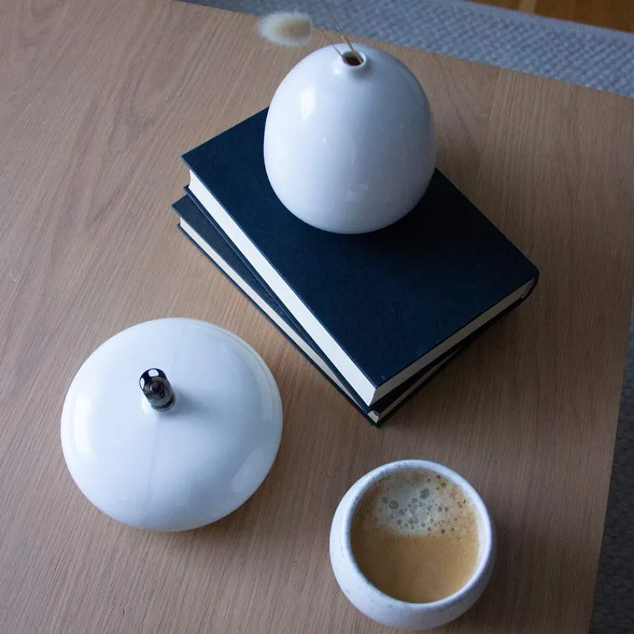 Denne oljelampen i porselen med hvit glasur er inspirert av naturens rullesteiner, formet av vannets bevegelser gjennom tidene. Med sin organiske form og glatte overflate gir den et stemningsfullt lys som skaper en koselig atmosfære i ethvert rom. Brenneren er laget av stål med en glassfiberveke som sikrer jevn flamme, og lampen er CE-godkjent for trygg bruk.