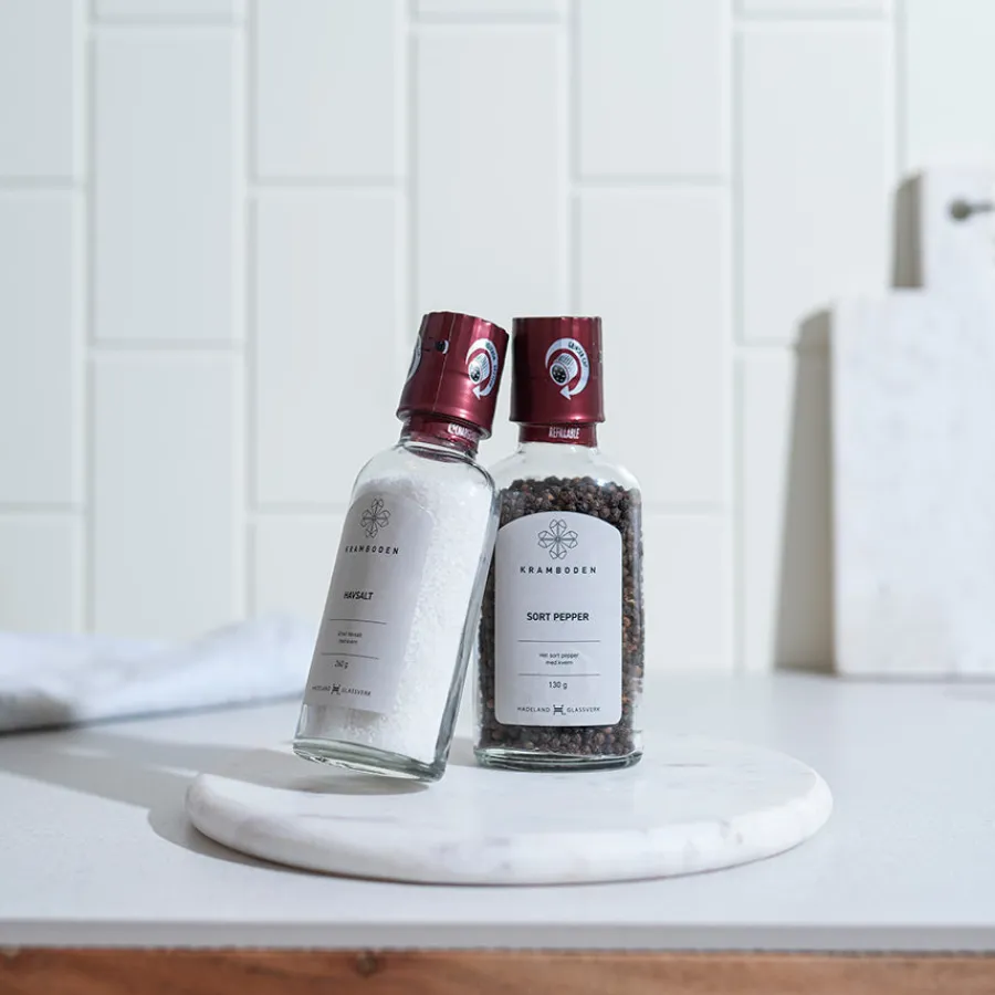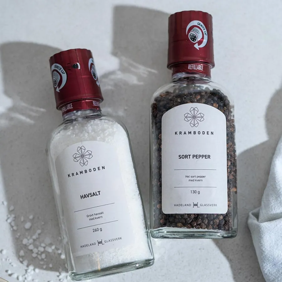 Saltkvern fra kramboden. Saltkvernen rommer 260 gram og kommer med grovt salt. Oppbevares tørt, og unngå kontakt med direkte sollys.