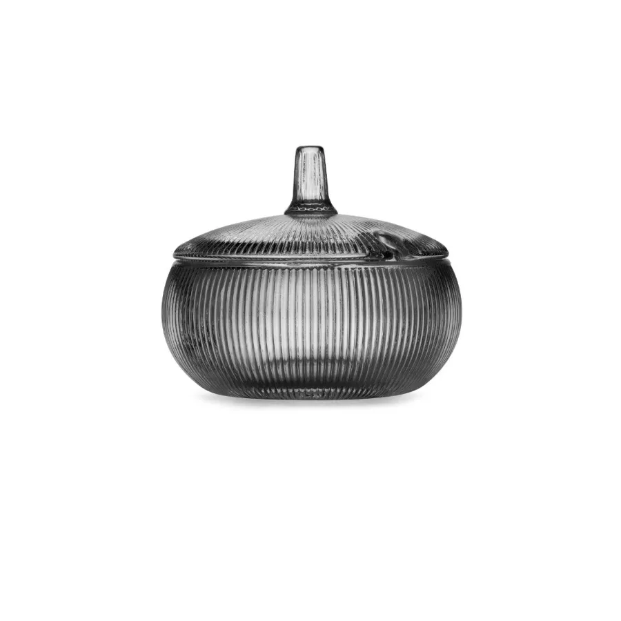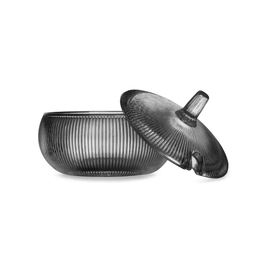 Skål med lokk fra Hadeland Glassverks serie Siri. Skålen er basert på Willy Johansons design fra 1954 og fått beholde de dekorative rillene i glasset, sammen med flere andre produkter fra Siri-serien som nylig ble relansert. Lokket på skålen har et hakk med plass til en skje slik at du alltid har sukker eller marmelade klart for servering.