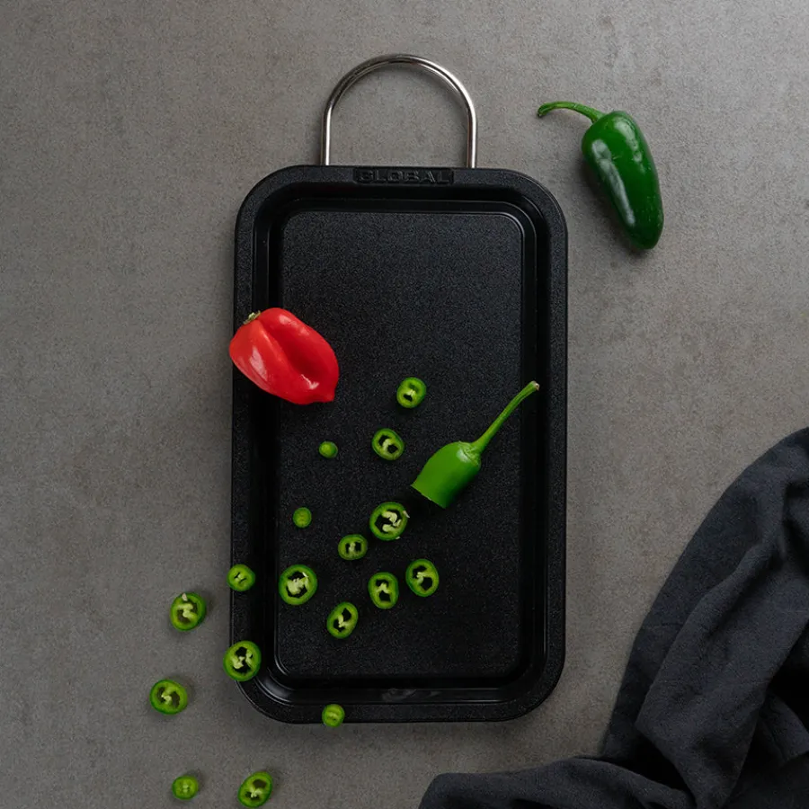 Globals stilrene plastskjærebrett kombinerer funksjonalitet og kvalitet. Laget av matgodkjent plast, er brettet skånsomme mot kniveggen, luktbestandige og enkelt å holde rent. Det praktiske skaftet i nikkelbelagt stål gir en ekstra glans. Skjærebrettet tåler oppvaskmaskin, men vask det på maks 60–70 °C for å unngå at det blir skeivt – la det gjerne ligge flatt til det er avkjølt etter vask slik at den finner sin form