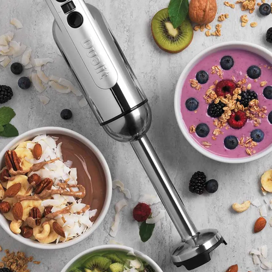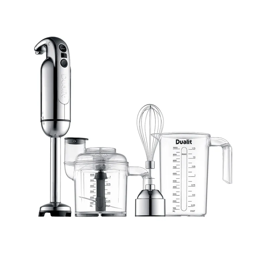 Stavmikser med praktisk tilbehør fra Dualit. Stavmikseren er utført i et stilfullt design i krom, og kommer med en motor på 700 watt. Med en hastighet med omdreininger på 7000 til 18000 per minutt er mikseren ideell til tilberedelse av alt fra smoothies og babymat, til supper og desserter. Stavmikseren er designet med en vakuum-beskyttelse slik at den ikke skal feste seg til bunnen av panner og boller. Kommer med 2 års garanti.