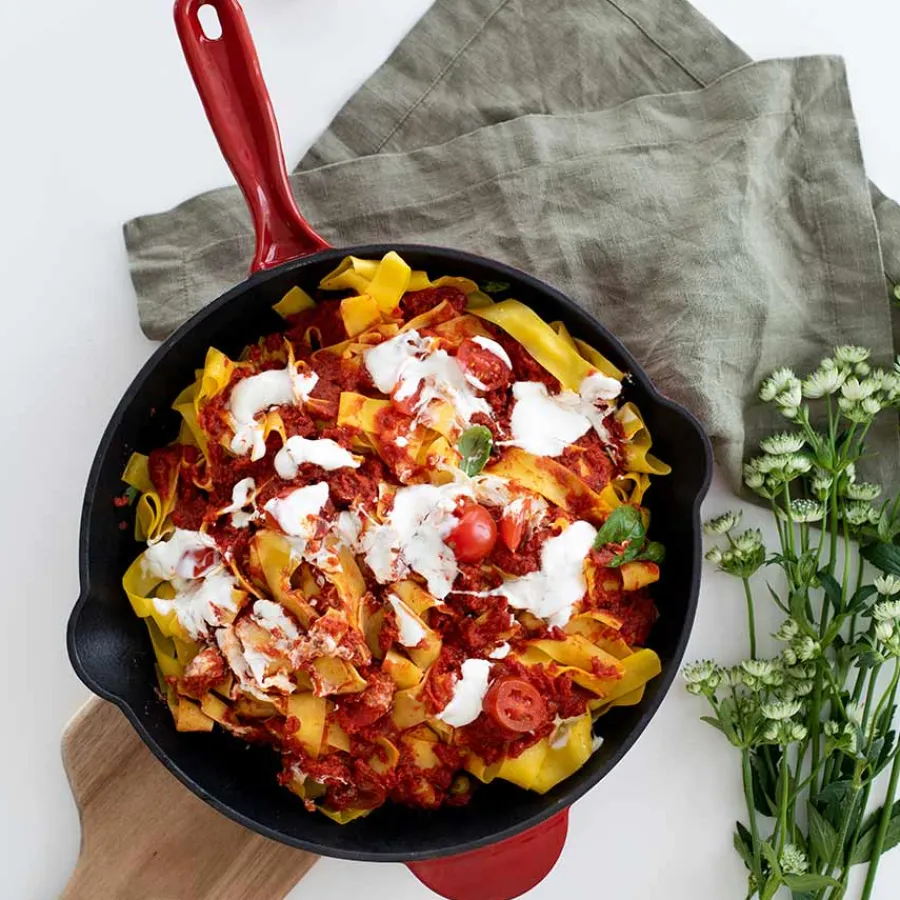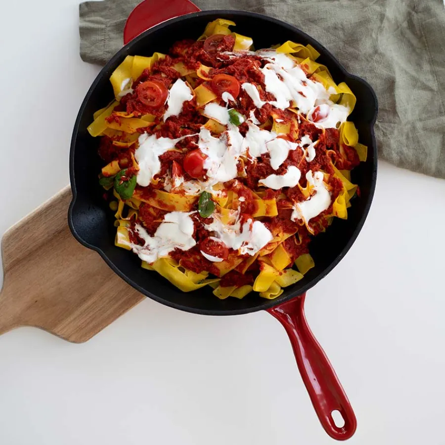 Rød støpejernspanne på 27 cm med emaljert fargebelegg fra Christiania 1739. En utmerket stekepanne som ved hjelp av materialet støpejern sikrer en jevn og god varmefordeling i hele pannen. Støpejernspannen tåler alle koketopper, inkludert induksjon. Håndvask av pannen anbefales. Unngå bruk av metallbørste og skurebørste da dette kan skade emaljen. Les mer om vedlikehold av pannen under tilleggsinformasjon.