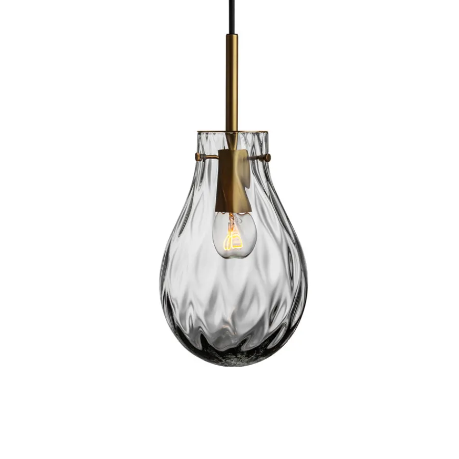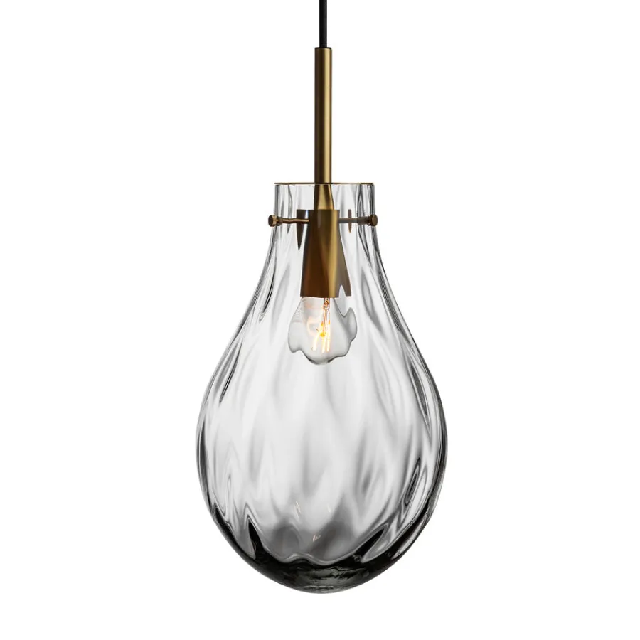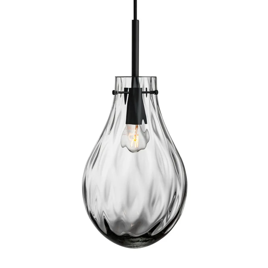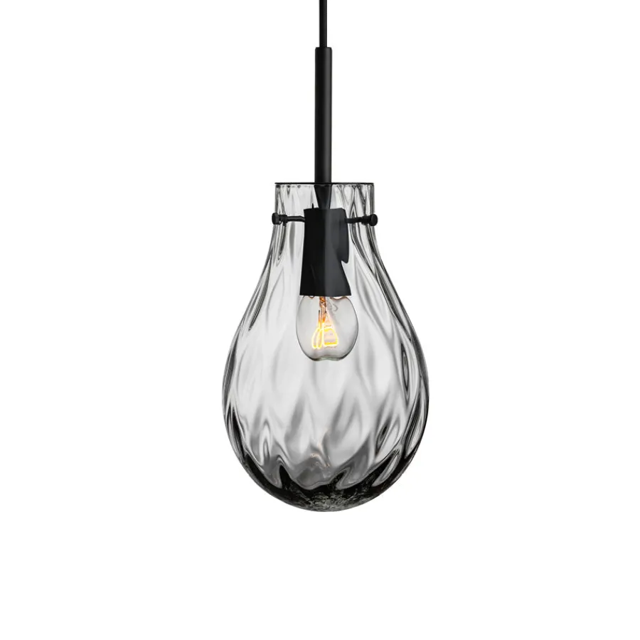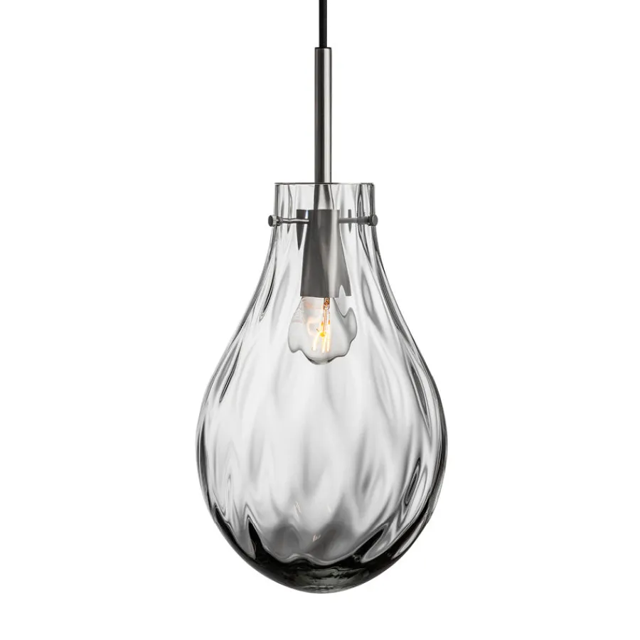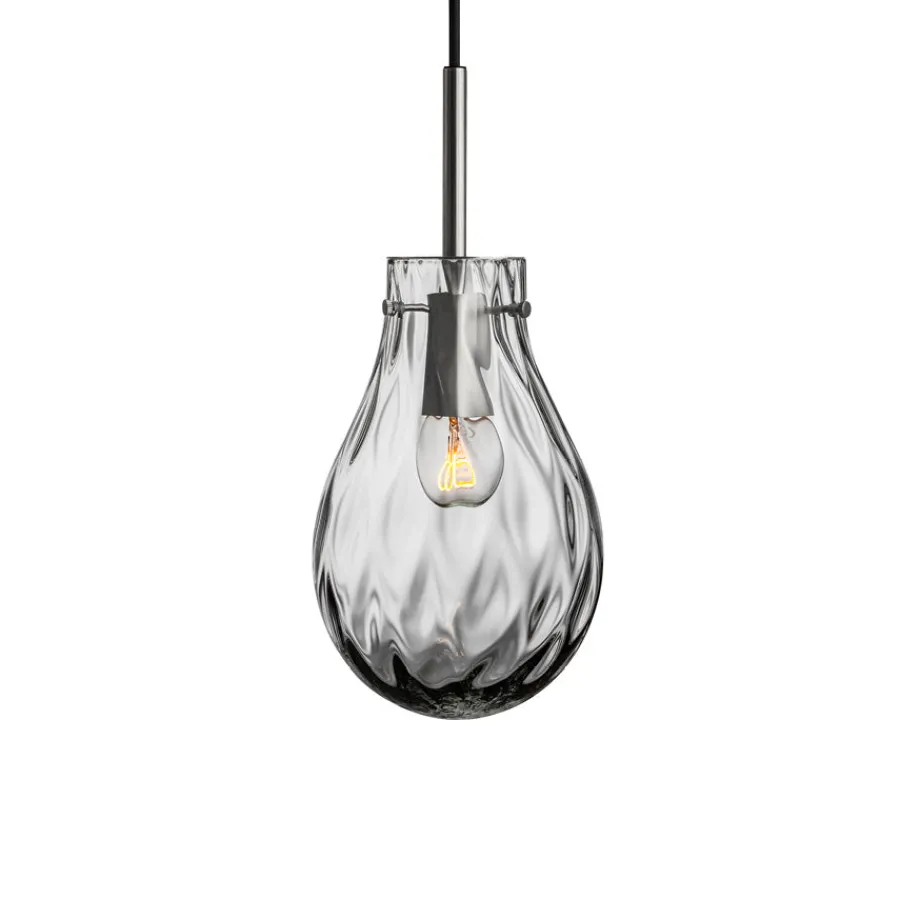 Dråpe pendellampe fra Hadeland Glassverk er en hyllest til vannets bevegelser og naturens eleganse. I lys røkgrått glass og med et særegent dobbeltoptisk mønster, skaper denne lampen et subtilt og stemningsfullt lysbilde som danser vakkert mot omgivelsene. Formen er inspirert av en fallende vanndråpe, og de to ulike mønstrene samspiller for å gi et levende og unikt uttrykk.
