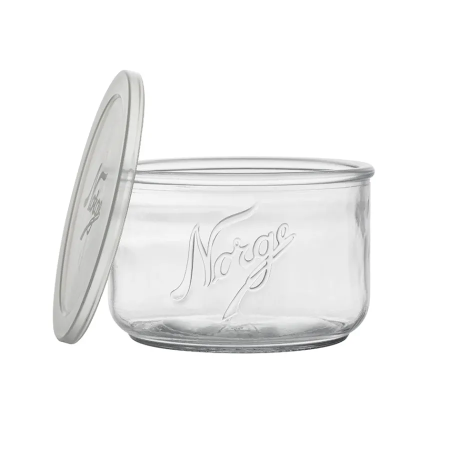Norgesglass med praktisk plastlokk. Oppbevaringsglasset er laget i sodaglass og dekorert med den ikoniske Norge-logen. Glasset er ideell til oppbevaring av alt fra tørrvarer til matrester og tilbehør.