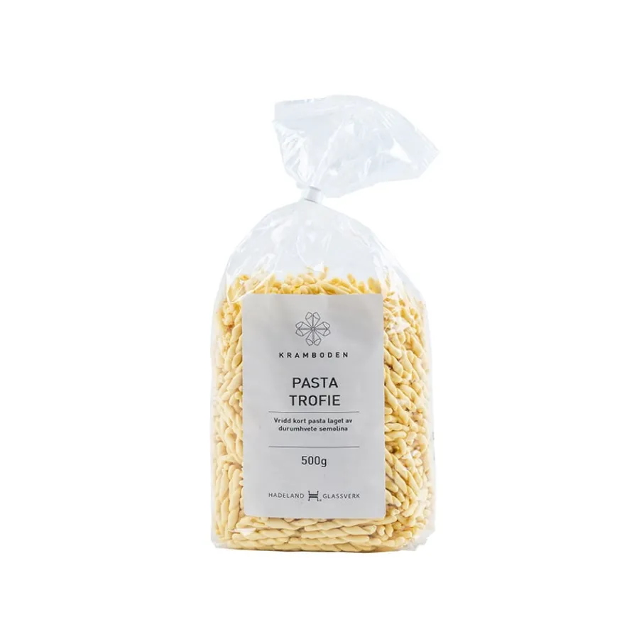 Pasta trofie fra Kramboden. Denne typen pasta er vridd til avlang kort pasta, og er utsøkt til pestoretter og sjømat. Pakken inneholder 500 gram pasta med en koketid på 12-15 minutter i lettsaltet vann.