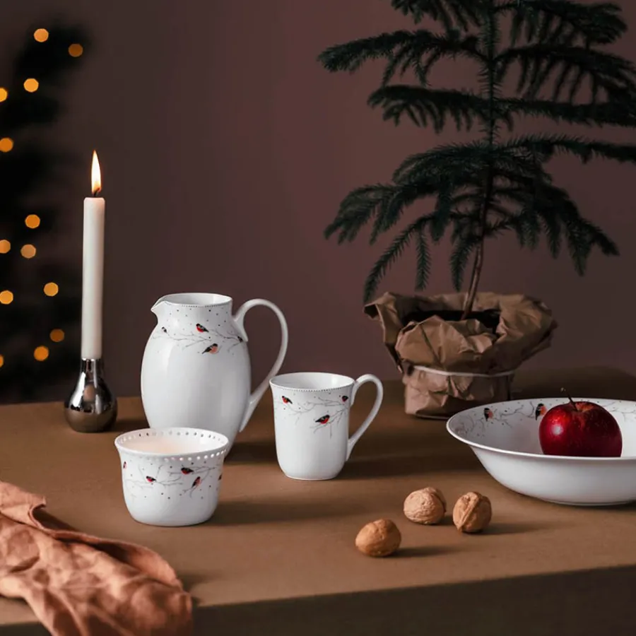 Telysholder fra det nostalgiske vinterserviset Dompap i benporselen fra Porsgrunds Porselænsfabrik. Lyslykten har motiv av dompapen med sitt røde bryst på en rimfrosset gren i hvitt vinterlandskap. Serviset passer spesielt fint i mørketiden og til julemiddagen, og telysholderen skaper en ekstra hyggelig stemning med levende lys.
