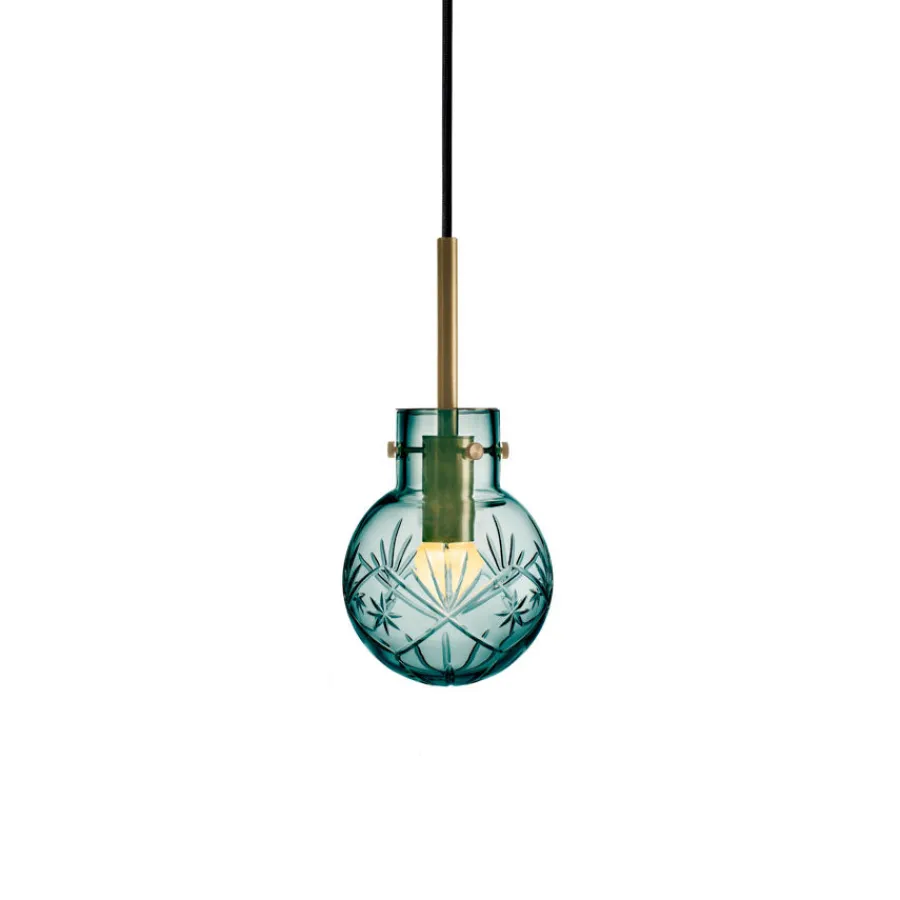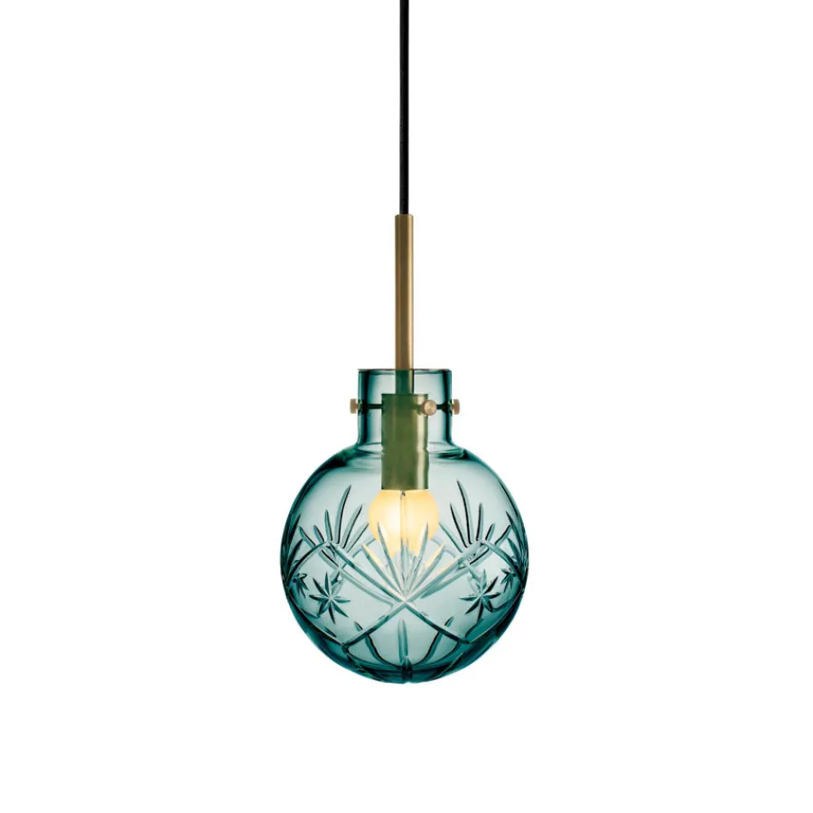 Krystallkule Taklampe Finn Blågrønn kombinerer et klassisk mønster med en frisk og elegant fargetone. Finn-mønsteret, designet i 1916, er et av våre mest populære og tidløse. Den glatte krystallkulen diamantslipes for hånd for å fremheve mønsteret, som gir et raffinert og levende spill i lyset.