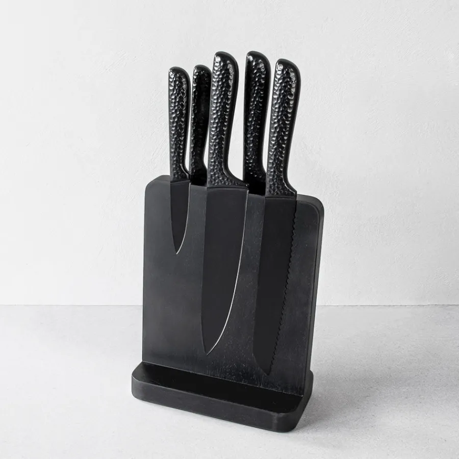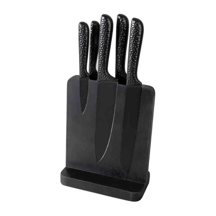 Knivblokk fra Christiania 1739 med 5 elegante kniver i rustfritt 3Cr13 stål. Knivblokken i gummitre har magnet som holder knivene på plass. Det anbefales å bruke knivsliper fremfor slipestål og vaske for hånd for å lengre bevare skarpheten på knivbladene.