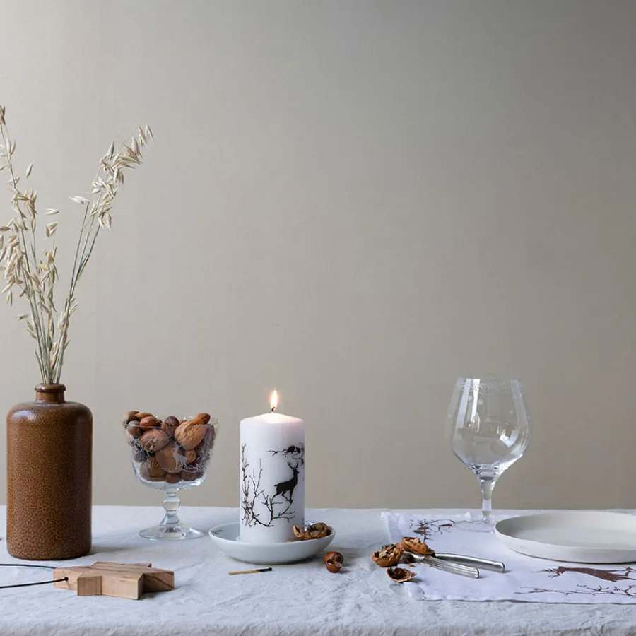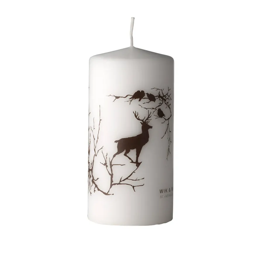 Kubbelys på 14 cm x 7 cm fra Wik & Walsøes eventyrlige serie Alveskog. Kubbelyset er dekket av dekorative elementer av den majestetiske hjorten, som omringes av bare grener.