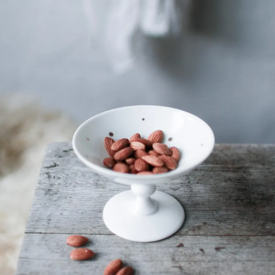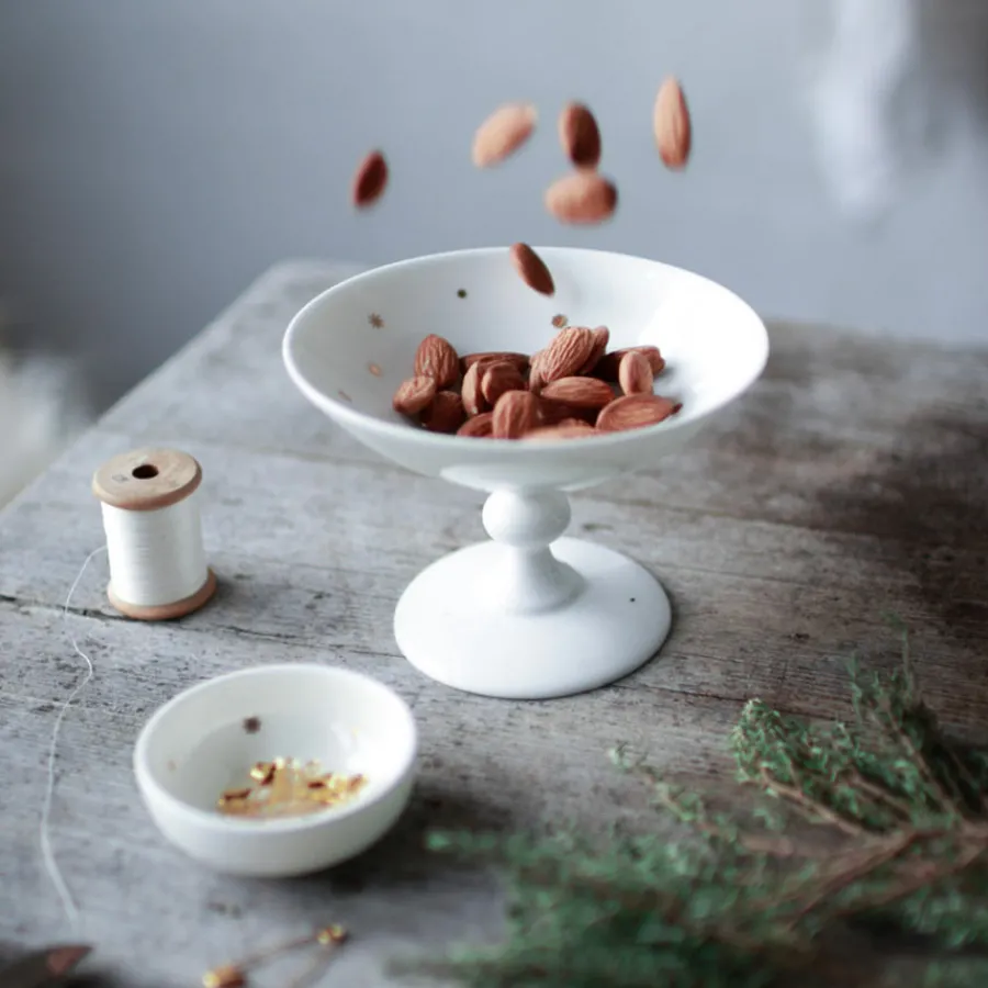 Skål på stett fra Wik & Walsøes eventyrlige servise Stjernedryss. Inspirert av det enkle og rene en stille og klar vinternatt formilder har den flotte serien fått vakre stjernedetaljer i 24 karat gull på hvitt benporselen. Skålens enkle former gjør den flott til ethvert hjem, til servering av konfekt eller det minste middagstilbehør. Skålen måler 12 cm.